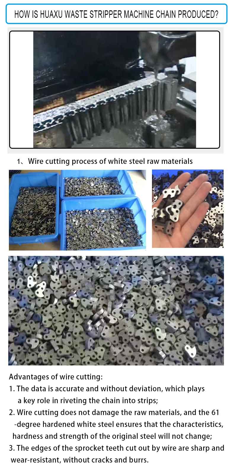 华旭清废机链条的材料选用优质的瑞典白钢,具有硬度高,韧性强,耐磨性好的特点,