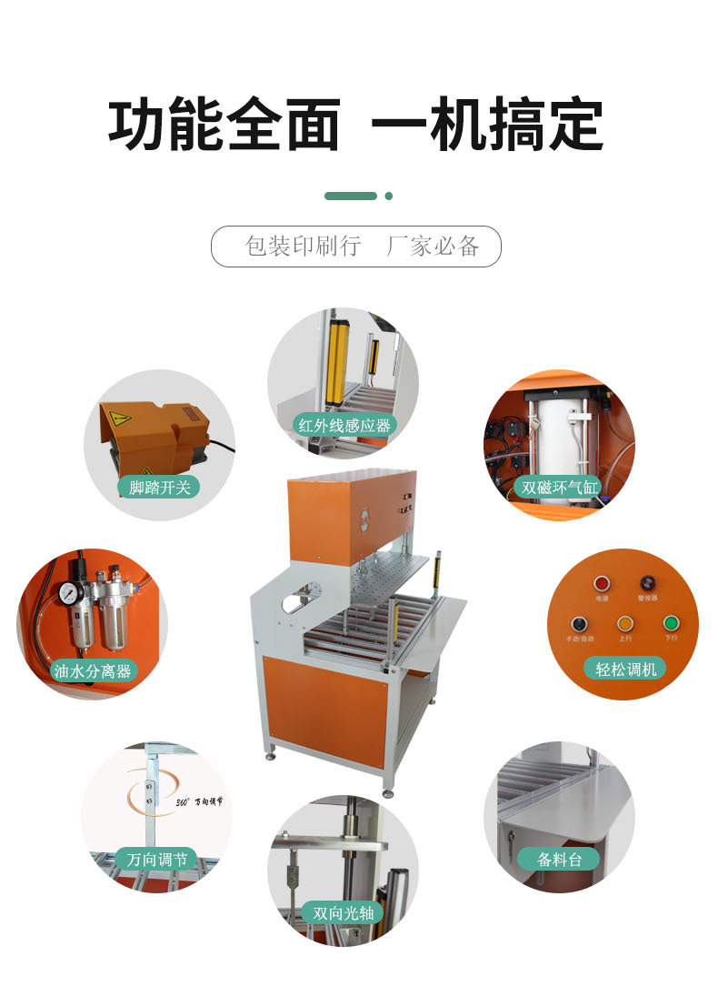 本机主要用于彩印包装企业的各种彩盒纸箱模切后所残留的内孔(圆孔、方孔、长条孔、飞机孔、异形孔...)废纸的清除。适用吊牌、纸盒、彩盒....等一个或多个中孔的清除。