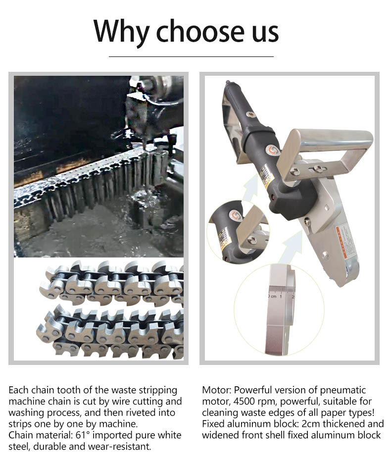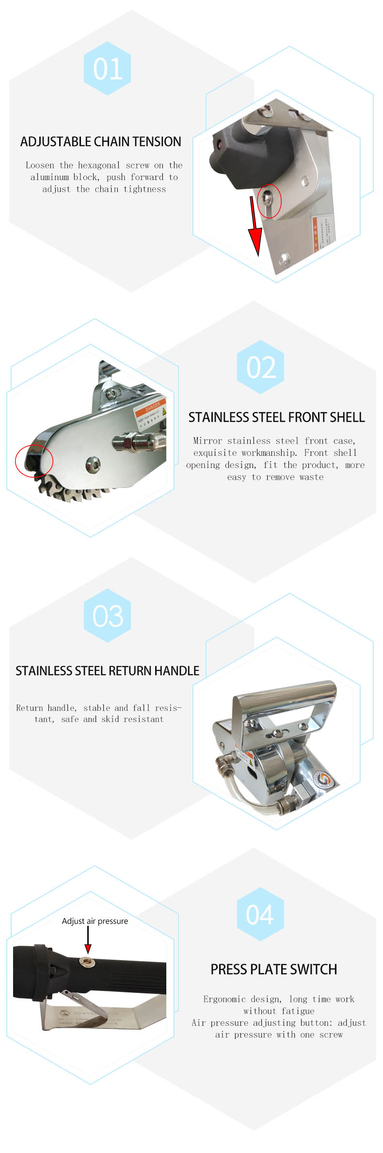 Clean the machine daily by pouring “kerosene, anti-rust oil, or pneumatic tool oil” into the air inlet and idling the machine to clean internal parts. Use an air gun to blow away paper scraps from the machine casing and chain gaps after work.